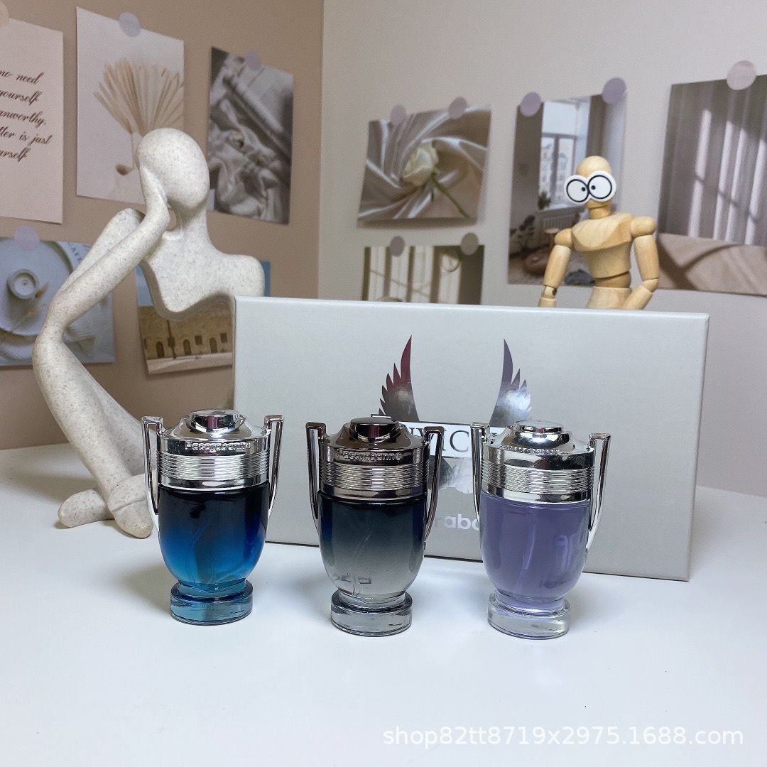 The perfume bottle is shaped like a small trophy or chalice, with a glossy black body and a gold cap, similar in style to "Invictus" by Paco Rabanne—suggesting that this might be an imitation or inspired version of that fragrance.