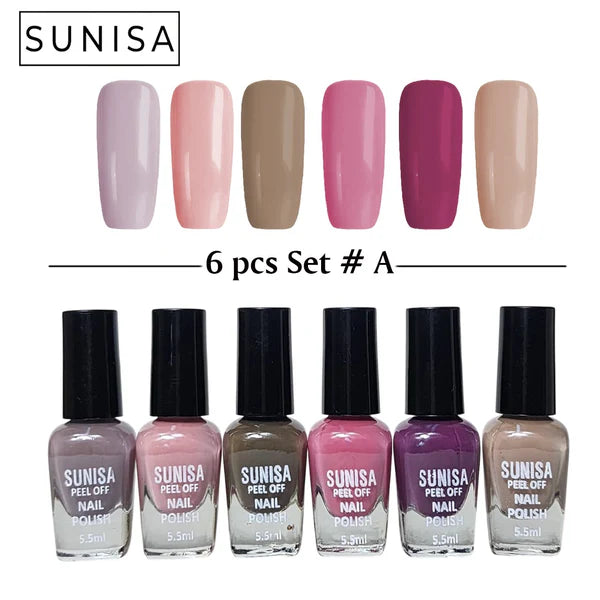 6 Sunisa Peel-Off Nail Polishes in trendy shades (red, black, maroon, and more) for flawless, no-mess manicures.