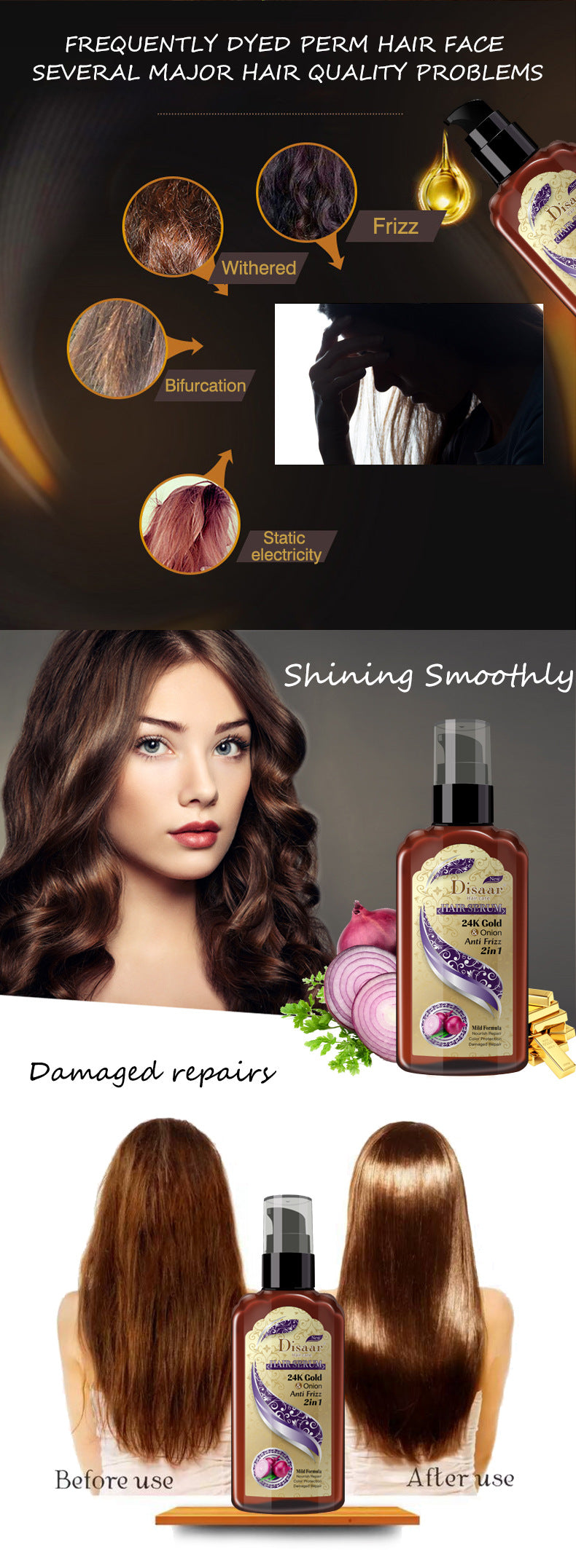 DISAAR 24K Gold & Onion Anti Frizz 2 in 1 Hair 0Serum 120ml- DS51983