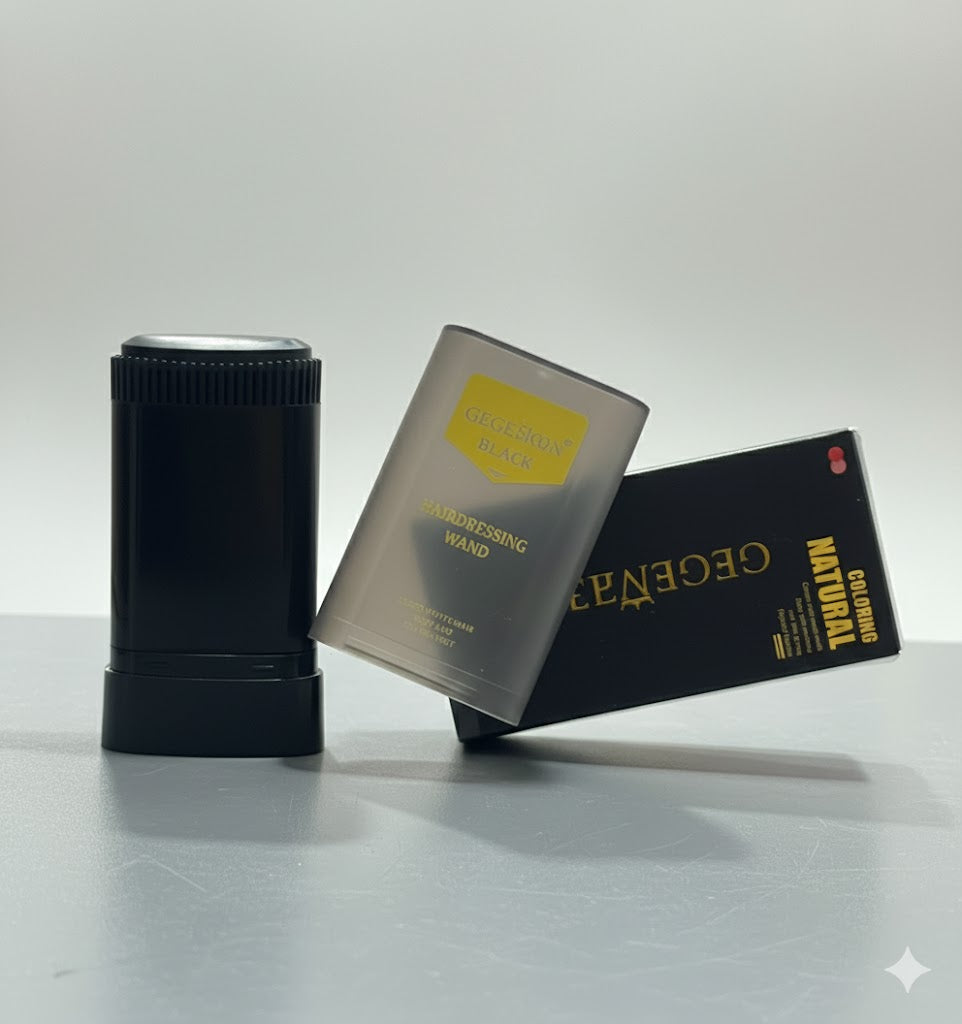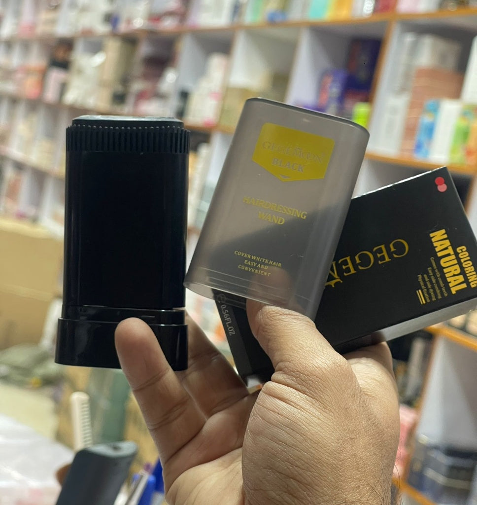 The image shows a product in a chunky stick or wand format, likely a hair coloring or styling product based on the packaging text ("Hairdressing Wand," "Coloring Natural," "Black").