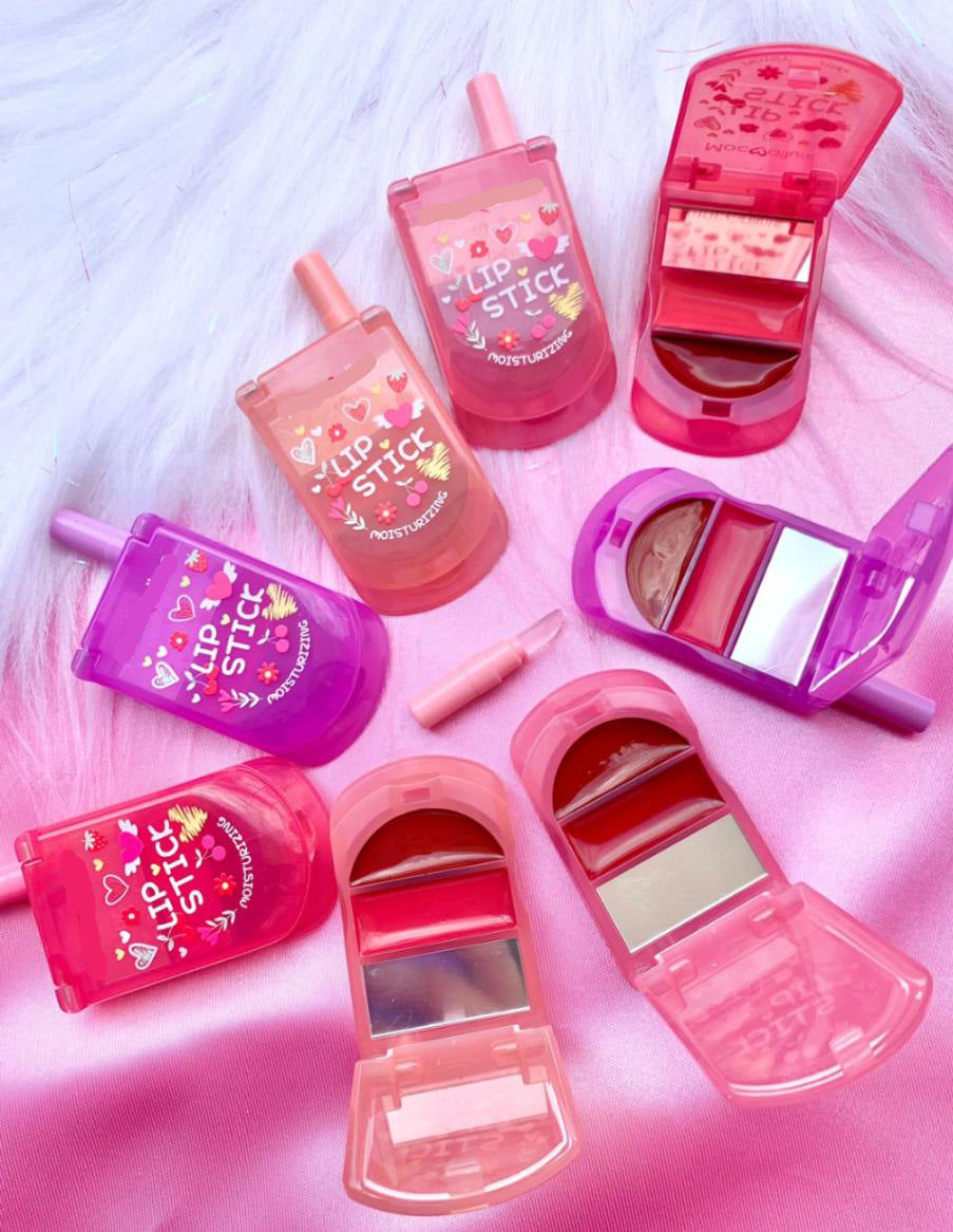 Closed Units: Several units are shown closed, featuring the brand name "Mac Allure" and text like "LIP STICK" and "MOISTURIZING" with heart and star graphics on the transparent top half. These are seen in purple/magenta, coral/orange-pink, and vibrant red.