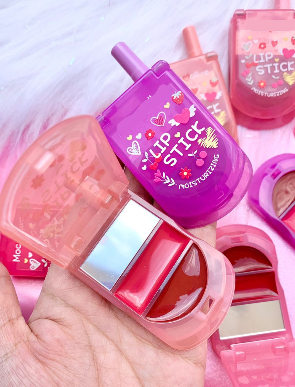 Open Units (Lip Palettes): Several units are displayed open, revealing the product inside. The flip design opens to show small palettes typically containing two or three coordinating shades of lip balm or solid lipstick, often accompanied by a small mirror in the "keypad" section of the phone.