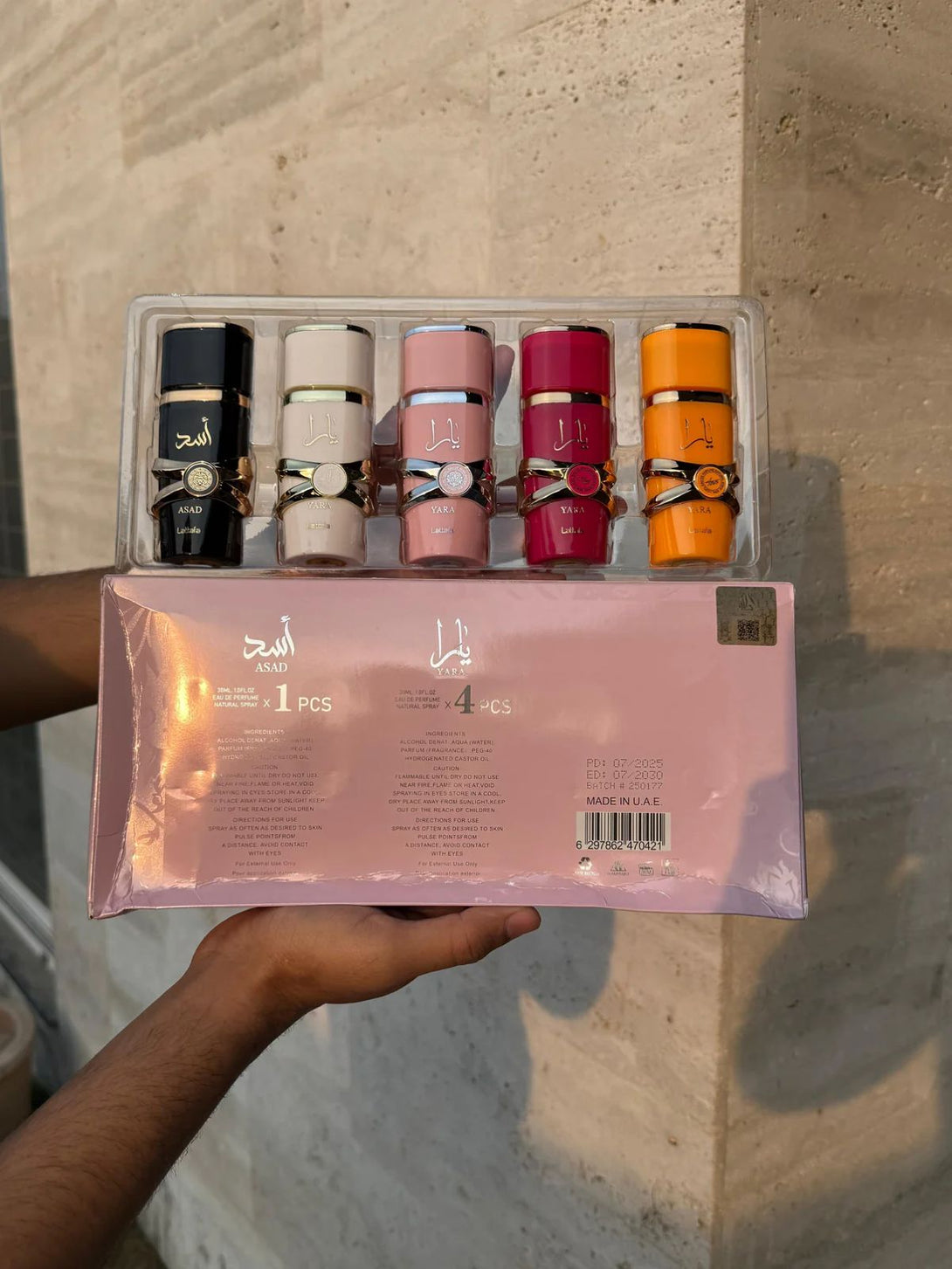 Featured Fragrances: Includes the highly sought-after Yara (known for its sweet, tropical, and creamy notes) and Asad (often described as a spicy, rich, and woody scent).