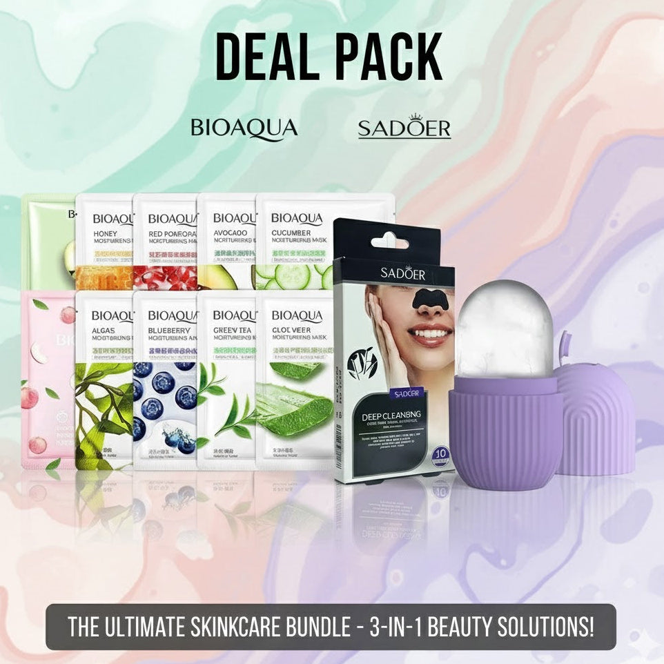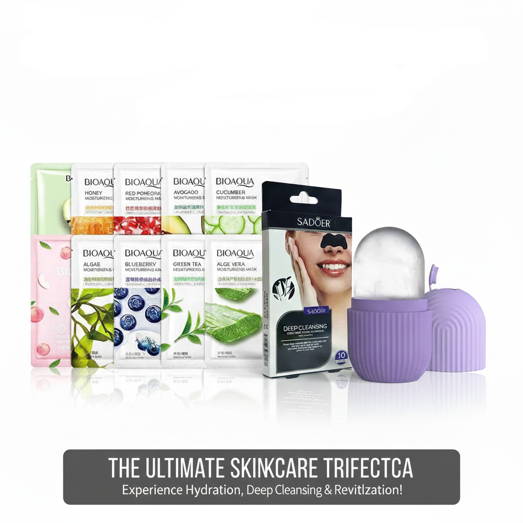 Experience the Ultimate Skincare Trifecta with this comprehensive bundle, combining the hydrating power of BIOAQUA sheet masks, the deep cleansing action of SADOER treatments, and the soothing benefits of an ice roller.