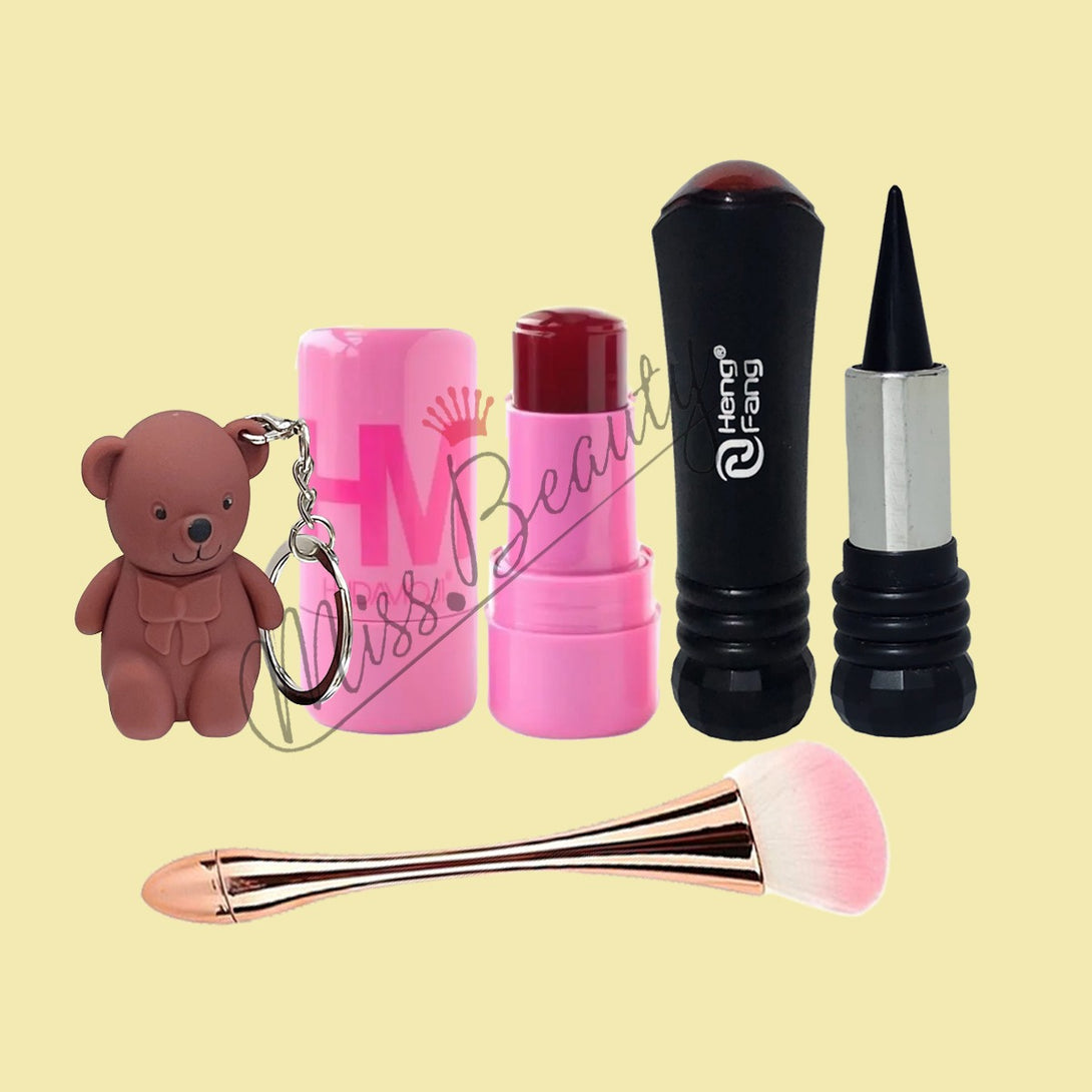 Miss Beauty New pack of 4 Makeup Deal Set in Random (1 pcs bear Keychain Lip gloss , 1pcs Heng Feng Eye Kajal , 1pcs Makeup Brush , 1pcs Jelly Lip tint )