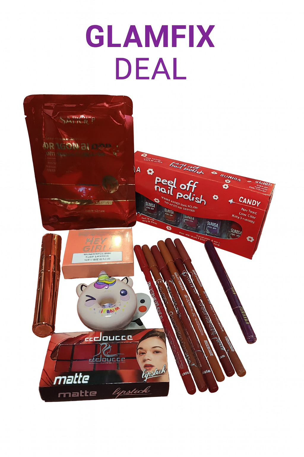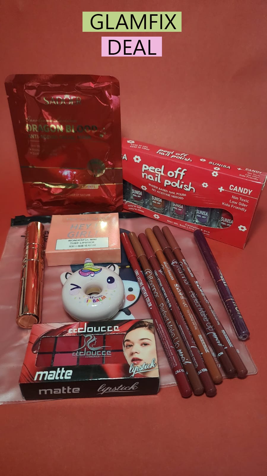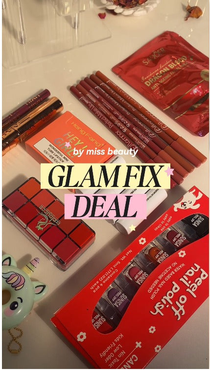 Get ready to glow with the Miss Beauty GLAM FIX DEAL, your all-in-one glam station for flawless everyday looks. This curated makeup combo includes lip liners, liquid lipsticks, nail polishes, and an eyeshadow & blush palette—everything you need to create a stunning full-face look.