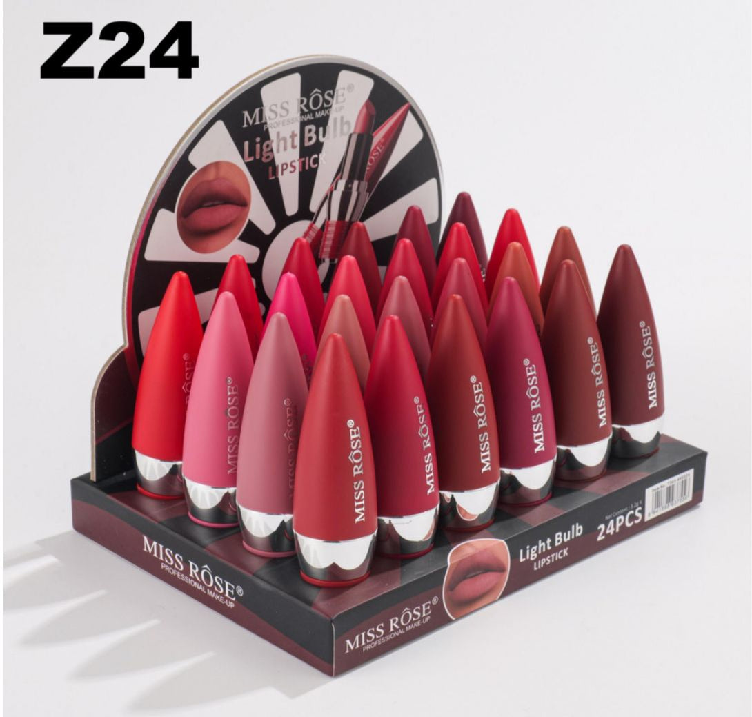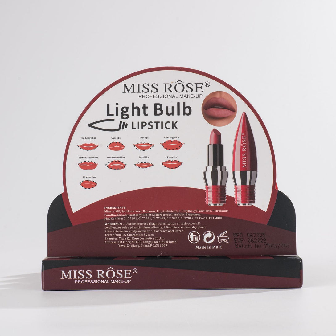 Illuminate your beauty routine with the Miss Rose Light Bulb Lipstick collection. This eye-catching set features 24 distinct shades housed in unique, light-bulb-shaped tubes that are as stylish as they are functional. Designed for "Professional Make-up" results, this collection offers a spectrum of colors ranging from soft everyday nudes to bold, dramatic reds and berries.