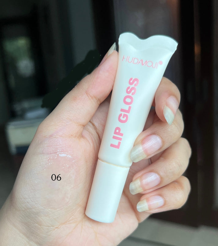 Packaging: Soft squeeze tubes with rounded, wavy tops and clear, rounded applicator tips. The applicators appear to be plastic with a small hole for dispensing the gloss, designed for direct application.
